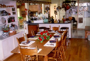 We are situated in an equestrian community of Albuquerque's North Valley, and, as you may have guessed, I serve raspberries at breakfast all year round -- fresh in season, or out of the freezer off season. (We pick 150 gallons.) Jams and jellies from home-grown fruit also grace the breakfast table along with fresh baked breads. The chickens who provide our eggs live in the backyard, and seasonings come from my herb garden.